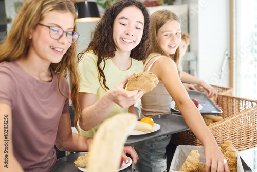 Children selecting fresh fruits and vegetables in a school cafeteria setting