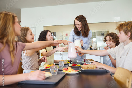 Students enjoying a cafeteria meal with teacher serving fresh drinks