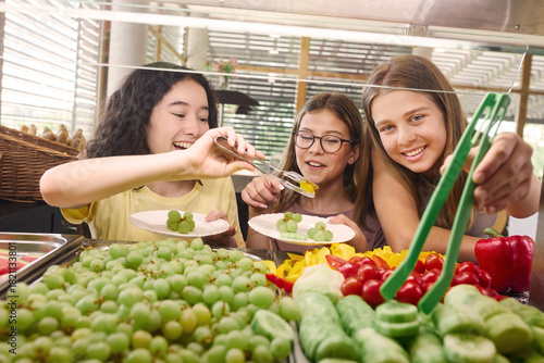 Children selecting fresh fruits and vegetables in a school cafeteria setting