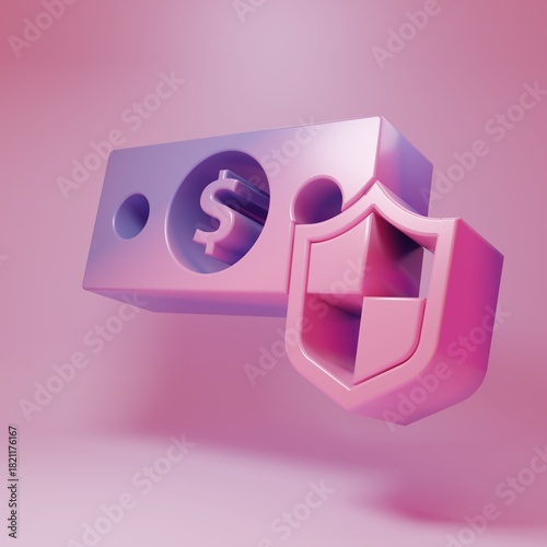 Purple-pink Money with shield icon isolated on pink background. Insurance concept. Security, safety, protection, protect concept. Minimalism concept. 3D render illustration #1821176167