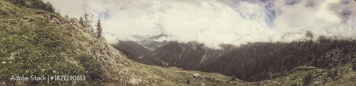 Panoramic mountain landscape with rocky terrain and scenic sky