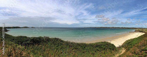 Panoramic view of a pristine beach with lush greenery under a blue sky