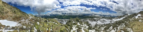 Panoramic mountain landscape with rocky terrain and alpine reflections under a vibrant sky