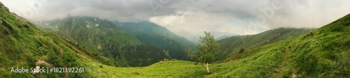 Scenic mountain panorama with green hills and cloudy skies, perfect for headers