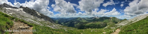 Mountainous panoramas with rocky terrain and green valleys under blue cloudy skies