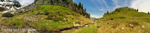 Panoramic alpine landscape with green meadows, rocks, and clear stream under blue sky