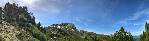 Scenic mountain panorama with lush greenery under a clear blue sky