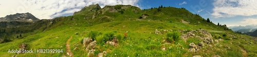 Panoramic rocky mountain trail with vibrant meadows under a clear blue sky