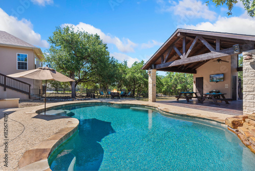 Tropical poolside paradise with lounge chairs and umbrellas for ultimate relaxation in sunny weather