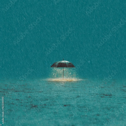 A lone umbrella in a vast expanse of teal water, illuminated by a golden light beneath it, as rain and snow fall all around. #1823384440