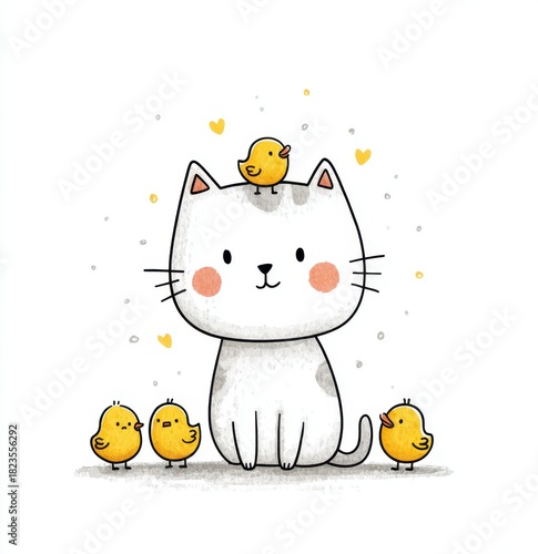 Cute White Cat With Yellow Chicks On White Background Cartoon Animal Illustration For Children's Designs And Spring Holiday Themes