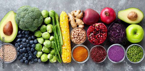 Assortment Of Colorful Fruits And Vegetables On Gray Background Including Avocado Broccoli Corn Pomegranate