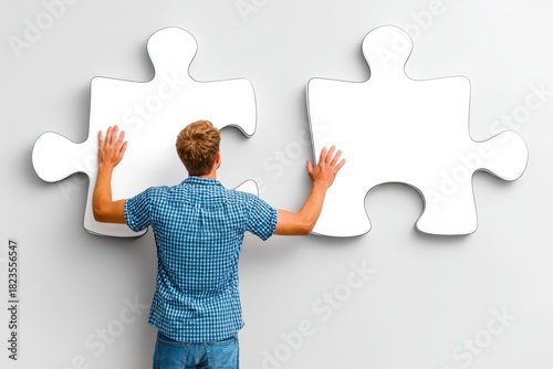 Man Connecting Two Large White Puzzle Pieces On Gray Wall; Symbolizing Teamwork; Solutions; And Problem Solving In Business