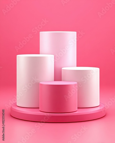 Pink Cylinder Podium Display On Pink Background For Product Showcase; Cosmetic Presentation; Or Advertising Campaign; Isolated Studio Shot
