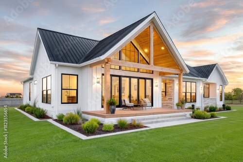 Modern Farmhouse Exterior With White Siding; Black Metal Roof; Wood Accents; and Green Lawn at Sunset For Real Estate And Architecture