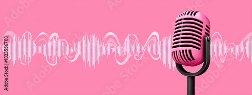 Retro Pink Microphone With Sound Waves On Pink Background For Podcast; Radio; Music Production And Audio Recording Projects And Presentations