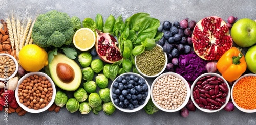 Assortment Of Colorful Healthy Food Ingredients In Bowls On Gray Background For Nutrition And Diet Concepts And Culinary Applications