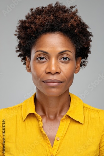 Studio shot ID portrait of Nigerian woman with natural hair in yellow shirt