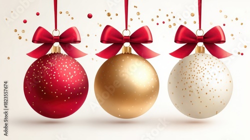 Three Christmas Ornaments With Red Bows Gold Confetti Isolated On White Background For Holiday Decorations And Festive Celebrations