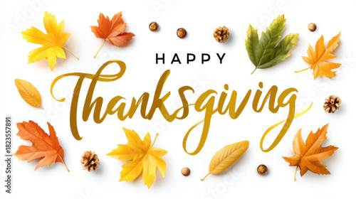 Happy Thanksgiving Calligraphy With Autumn Leaves And Pine Cones On White Background For Holiday Greetings And Seasonal Celebrations