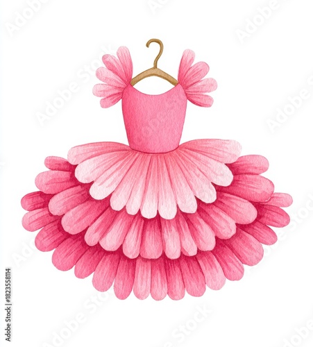 Watercolor Pink Dress With Petals On Hanger Isolated On White Background For Fashion And Children's Designs; Invitations And Celebrations