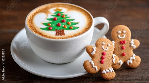 Festive Christmas Cappuccino With Gingerbread Men And Tree Art On Wooden Table For Holiday Season And Winter Celebrations
