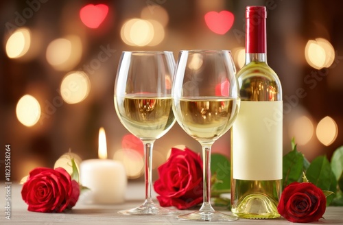 Romantic Wine Glasses With White Wine And Red Roses For Valentine's Day; Anniversary Or Special Occasion Celebration; Bokeh Background