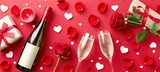Romantic Red Background With Wine Bottle Champagne Flutes Rose Gift Box Candle And Heart Petals For Valentine