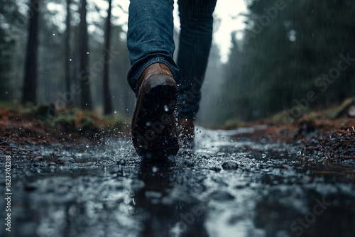 Joyful child in colorful rain boots jumping into a puddle on a rainy day