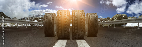 Vier Reifen bei Regen auf nasser Fahrbahn