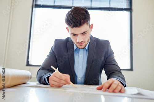 Bauzeichner arbeitet am Schreibtisch