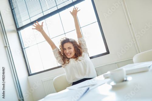 Geschäftsfrau beim Rücken dehnen am Schreibtisch