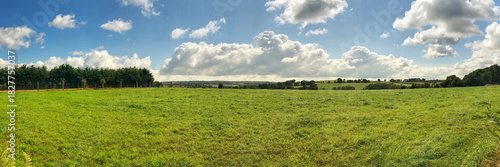 Panoramic view of a green field with a blue sky and fluffy clouds