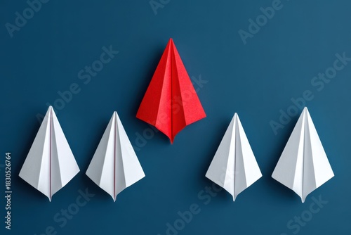 Red Paper Airplane Leading White Ones On Blue Background For Leadership Innovation And Business Concepts Standing Out From The Crowd