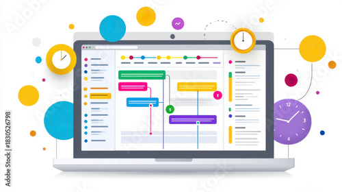 Laptop Displaying Project Timeline With Colorful Elements On White Background For Business Planning And Time Management Concepts