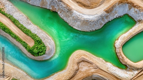 Aerial View of Turquoise Water Channels and Earthworks Mining Landscape From Above Industrial Extraction Site With Green Water