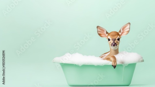 Adorable fawn in a bathtub surrounded by fluffy white bubbles
