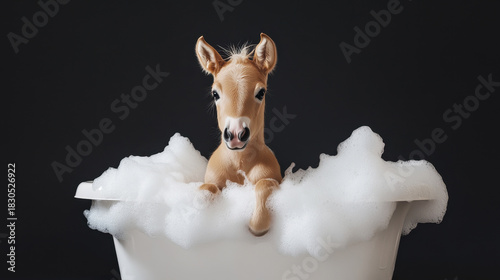 Adorable foal sitting in bathtub surrounded by white soap foam bubbles