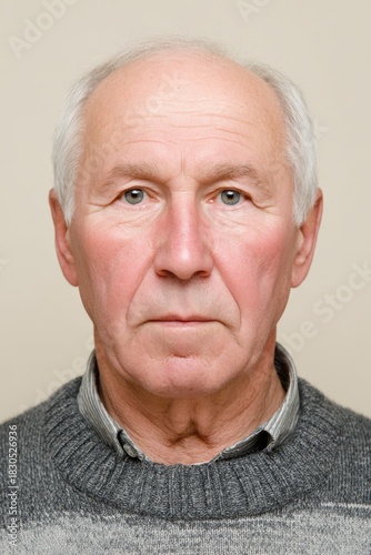 Neutral passport ID portrait of an elderly Russian Caucasian man wearing a gray sweater