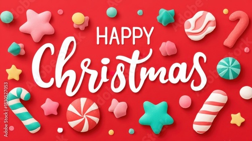 Festive Christmas Candies On Red Background With Happy Christmas Text For Holiday Season Greetings And Celebrations Sweet Treats