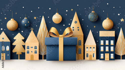 Festive Holiday Scene With Gift Box Christmas Ornaments and Decorative Houses on a Dark Blue Background for Christmas Celebrations