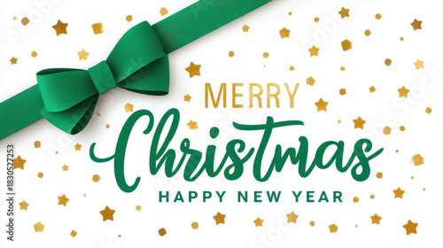 Merry Christmas And Happy New Year Greeting Card With Green Ribbon Bow And Gold Stars On White Background For Holiday Seasonal