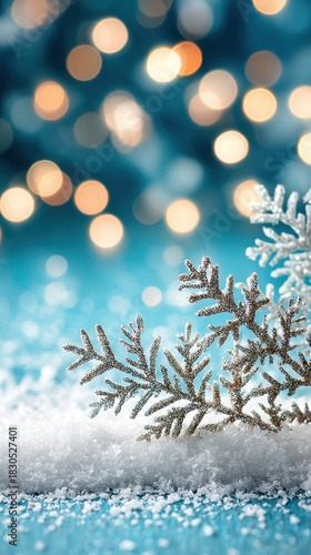 Silver Glitter Snowflake Decorations On Snow With Bokeh Lights On Blue Background For Winter Holiday And Christmas Season Designs And Projects