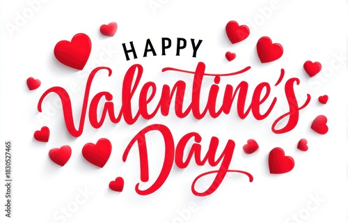 Happy Valentine's Day Calligraphy With Red Hearts On White Background For Love Romance And Holiday Celebrations Design