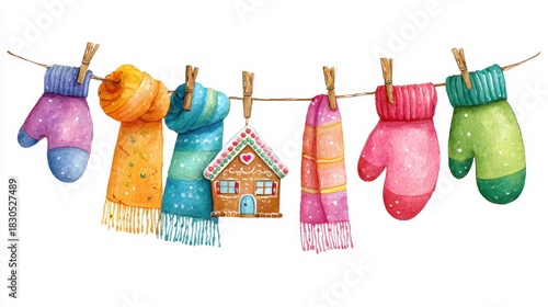 Watercolor Mittens Scarves And Gingerbread House Hanging On Clothesline Isolated On White Background For Winter Holiday Designs And Decorations