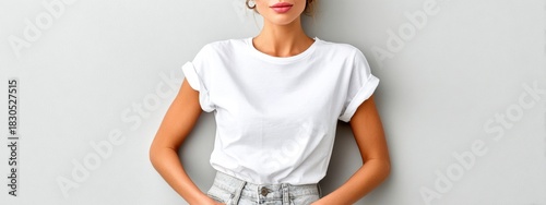 Woman Wearing White T-Shirt and Jeans Against Gray Background For Fashion Casual Wear and Clothing Mockups and Design Templates