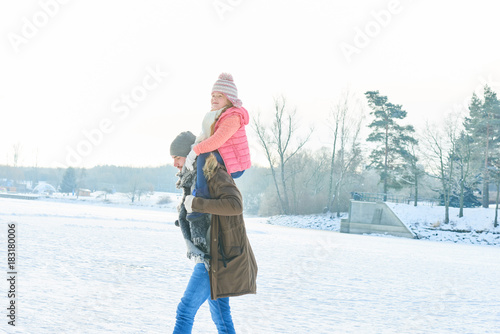 Familie hat Spaß beim Schlitten fahren und rodeln