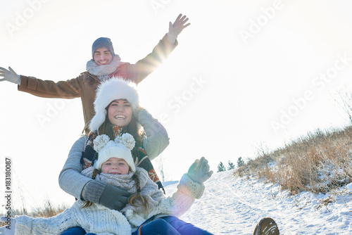 Familie hat Spaß beim rodeln auf dem Schlitten