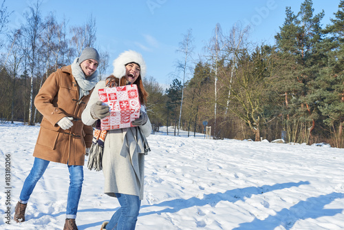 Lachendes Paar trägt ein Weihnachtgeschenk
