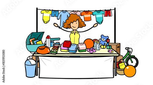 Frau verkauft gebrauchte Babykleidung auf Babyflohmarkt